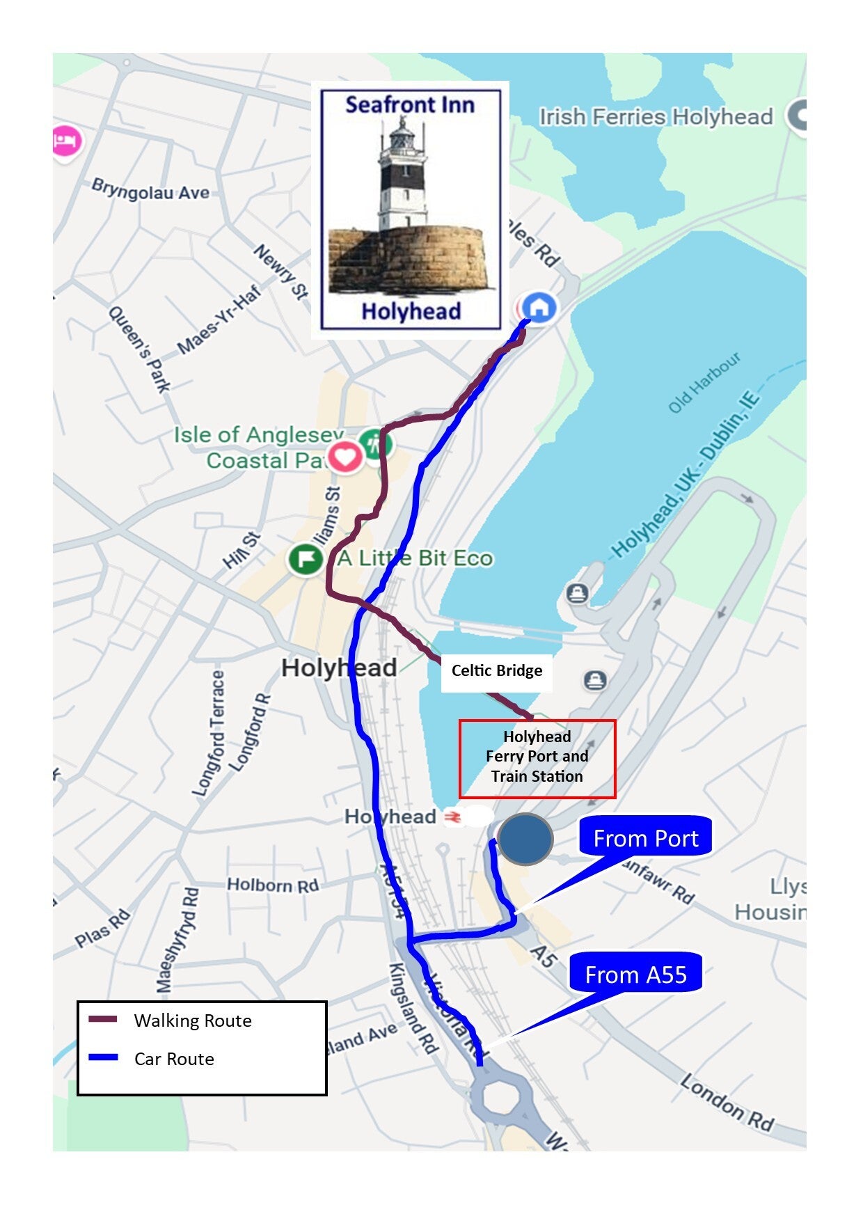 Directions from the Seafront Inn to and from Holyhead Ferry Port